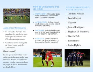 El documento describe los aspectos fundamentales del fútbol. El fútbol es un deporte de equipo que se juega entre dos equipos de 11 jugadores cada uno. Para ser un buen jugador de fútbol se requiere motivación, aptitud física, disciplina y habilidad. El fútbol es uno de los deportes más populares del mundo y se originó en las islas británicas durante la Edad Media a partir de juegos de pelota similares. Algunos de los jugadores más destacados a nivel mundial son Cristiano Ronaldo,