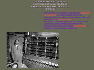 La arquitectura de Von Neumann utiliza el mismo dispositivo de almacenamiento para instrucciones y datos, a diferencia de Harvard. La mayoría de computadoras modernas siguen esta arquitectura. Las CPUs AMD e Intel comparten características como reducir el calor y consumo, mientras AMD usa un enlace de alta velocidad y Intel permite precargar la cache.