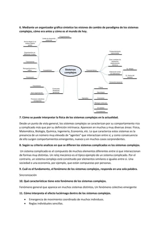 Este documento presenta preguntas y respuestas sobre sistemas complejos según diferentes autores y teorías. Aborda temas como las características de sistemas complejos, fenómenos emergentes, sincronización, formación de patrones y comportamiento de grupos. Explica que los sistemas complejos surgen de interacciones entre elementos que dan lugar a propiedades nuevas a escalas mayores.
