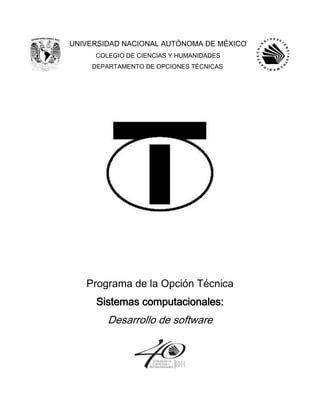 Este documento presenta el programa de la Opción Técnica en Sistemas Computacionales: Desarrollo de Software de la Universidad Nacional Autónoma de México. Describe la evolución del programa a través de los años y las modificaciones realizadas para mantenerse actualizado. El objetivo de la opción es capacitar a los estudiantes en el análisis, diseño y desarrollo de sistemas computacionales mediante el uso de lenguajes de programación. El enfoque didáctico incluye trabajo en equipo, resolución de problemas reales y el
