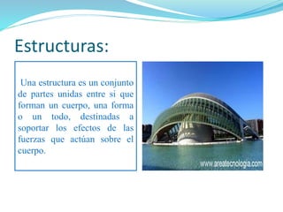 El documento describe diferentes tipos de estructuras, incluyendo estructuras metálicas como cerchas, marcos portantes, cables de suspensión y puentes colgantes. También discute métodos de construcción como la losa de elevación y estructuras modulares. Proporciona ejemplos de aplicaciones como la Sagrada Familia y puentes notables.