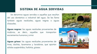 Este documento describe los diferentes tipos y tratamientos de aguas servidas. Explica que las aguas servidas incluyen aguas negras, grises y negras industriales. Detalla los procesos de tratamiento biológico aerobio y anaerobio, incluyendo digestión aerobia del fango, filtros anaerobios y tratamiento terciario. También cubre conceptos como DBO, DQO, oxígeno disuelto y desinfección a través de lagunas de oxidación.