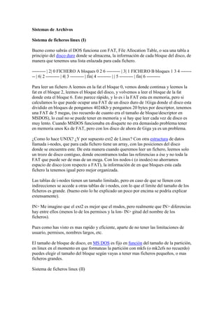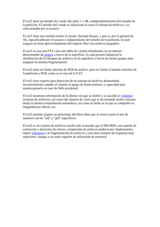El documento compara los sistemas de archivos MS-DOS y ext2 de Linux. Mientras MS-DOS usa una tabla de asignación de archivos (FAT) que puede ocupar mucho espacio y ser lenta, ext2 usa "i-nodos" que almacenan la ubicación de los bloques de un archivo de forma contigua, haciendo las lecturas más rápidas. Ext2 también permite tamaños de bloque y archivo más flexibles, detecta y recupera errores de forma automática, y mantiene metadatos sobre la integridad y uso del sistema de archivos