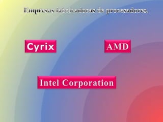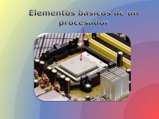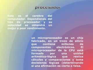 Un microprocesador es un chip que contiene millones de componentes electrónicos y constituye el cerebro de la computadora. A través de los años, los procesadores han ido mejorando su rendimiento al integrar más transistores y núcleos en un solo chip, lo que permite procesar tareas en paralelo de forma más eficiente. La memoria cache y el bus del procesador también son elementos importantes para la velocidad del sistema.