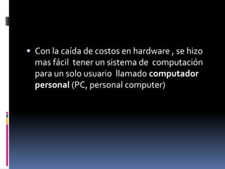 Los primeros computadores personales aparecieron en la década de 1970 y eran más pequeños y económicos que los computadores principales. Con el tiempo, los dispositivos de entrada y salida cambiaron de lectores de tarjetas y impresoras de línea a teclados, mouse, pantallas e impresoras. La caída en los costos del hardware permitió implementar conceptos avanzados de sistemas operativos como tiempo compartido y memoria virtual en los microcomputadores.