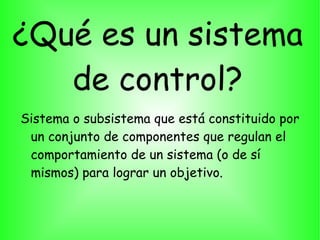Un sistema de control consta de sensores, un controlador y actuadores que trabajan juntos para lograr que una variable de salida alcance un objetivo deseado a pesar de las perturbaciones. Los sistemas de control de lazo cerrado son más precisos, estables y rápidos que los de lazo abierto al utilizar realimentación de la salida, aunque también son más complejos e inestables. El objetivo de un sistema de control ideal es garantizar la estabilidad, ser robusto y eficiente.