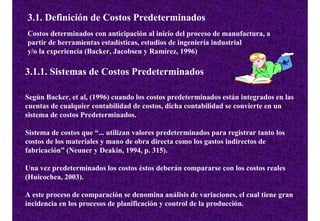 Este documento describe los sistemas de costos predeterminados, incluyendo costos estimados y costos estándar. Explica que los costos predeterminados se calculan con anticipación utilizando técnicas estadísticas e ingeniería industrial. También compara las ventajas y limitaciones de los costos estimados frente a los costos estándar, señalando que los estándar se basan en estudios más rigurosos pero son más difíciles de mantener. Finalmente, menciona algunos métodos para predeterminar costos como estimaciones de ingeniería industrial y
