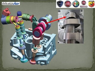 Este documento describe un sistema de distribución desmodrómica y un colector de admisión de geometría variable para motores. La distribución desmodrómica controla la apertura y cierre de las válvulas mediante levas en lugar de muelles, mejorando el rendimiento a altas rpm. El colector de admisión variable optimiza la onda de presión en los conductos para mejorar el par motor a bajas rpm y la potencia a altas rpm.