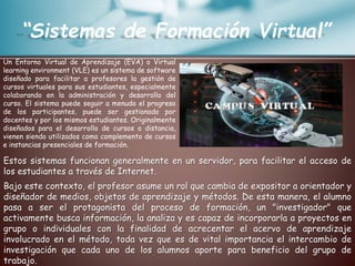 Este documento describe los sistemas de formación virtual y la plataforma Chamilo en particular. Los sistemas de formación virtual funcionan en un servidor para facilitar el acceso de los estudiantes a través de Internet, permitiendo que el profesor asuma un rol de orientador y diseñador mientras que los estudiantes toman un papel más activo. Chamilo es un sistema de código abierto para gestionar cursos virtuales que es fácil de usar, personalizar e instalar. Tiene las herramientas necesarias para crear y administrar cursos en línea