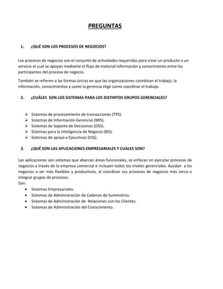 Este documento describe los diferentes sistemas de información para apoyar a los gerentes en los distintos niveles de una organización. Explica que los procesos de negocios son conjuntos de actividades que crean productos y servicios a través del flujo de información entre participantes. Los sistemas de procesamiento de transacciones proveen información básica a los gerentes operacionales, mientras que los sistemas de información gerencial y de soporte a decisiones apoyan a gerentes de niveles más altos. También describe la inteligencia de negocios y