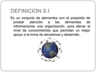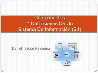 Este documento define los componentes clave de un sistema de información y los describe brevemente. Un sistema de información consta de usuarios, contenido de datos, software, hardware y un administrador. El software incluye el sistema operativo y software de gestión de datos, mientras que el hardware se refiere al equipo físico como las unidades centrales de procesamiento y periféricos.