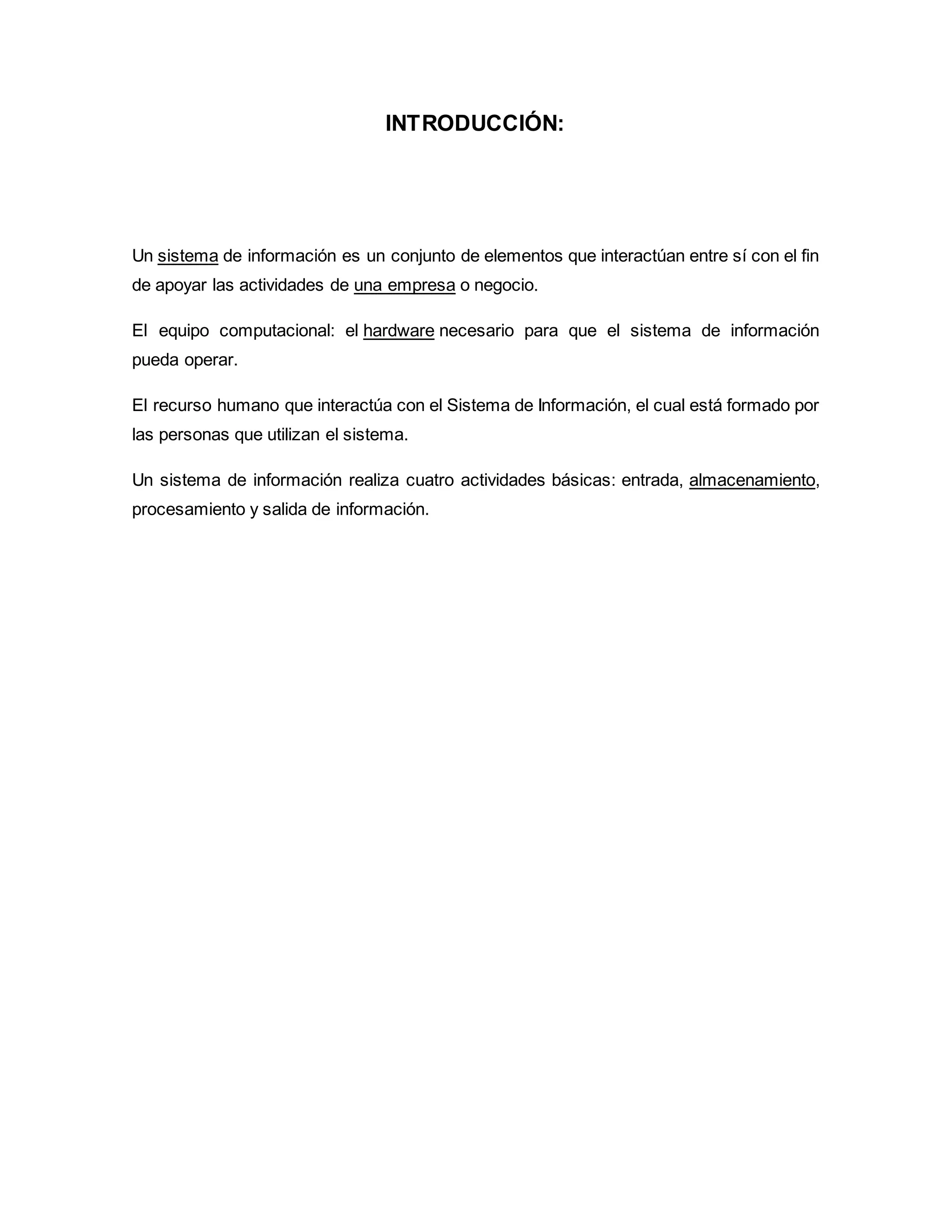Este documento define un sistema de información y describe sus elementos clave. Un sistema de información es un conjunto de elementos como personas, datos, actividades y recursos materiales que interactúan para procesar datos y generar información. Los sistemas de información realizan cuatro actividades básicas: entrada, almacenamiento, procesamiento y salida de información. Existen diferentes tipos de sistemas de información y todos pasan por un ciclo de vida que incluye diseño, codificación, implementación y mantenimiento.