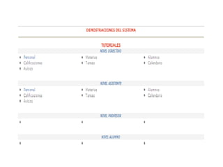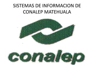 El documento describe varios sistemas de información utilizados en CONALEP Matehuala. El SAE es un sistema de administración escolar controlado desde la Dirección General que ayuda con funciones como registro de alumnos y maestros. El sistema de control de cajas permite consultar pagos de alumnos. El reloj checador digital lleva el registro de trabajadores y puede funcionar de forma separada o conjunta con los sistemas Punch-net-generic y Quick Tempo para transferir y obtener reportes de información de checadas.