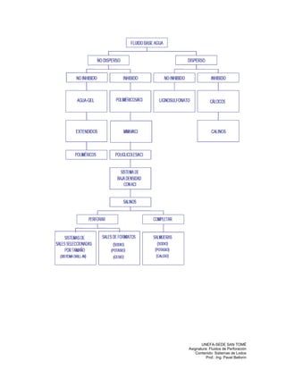 Este documento describe diferentes tipos de fluidos de perforación, incluyendo fluidos basados en agua, lignosulfonatos, cal, polímeros y fluidos viscoelásticos. Explica las clasificaciones, propiedades y usos de cada tipo de fluido.