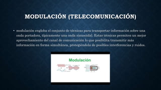 Este documento describe diferentes tipos de modulación utilizados en sistemas de telecomunicaciones, incluyendo modulación de amplitud, frecuencia, fase, banda lateral única y múltiples variantes. Explica cómo estas técnicas permiten transmitir información sobre una onda portadora y mejoran la eficiencia espectral del canal de comunicación. También cubre aplicaciones y tecnologías asociadas como radio, moduladores, demoduladores y más.