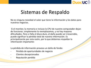 Este documento describe los sistemas de respaldo y su importancia para proteger la información de una empresa ante fallas o desastres. Explica los diferentes tipos de respaldo como completos, incrementales y diferenciales, así como los medios de respaldo como unidades extraíbles, arreglos de discos duros y unidades de red. También cubre software para automatizar respaldos, tanto para equipos individuales como corporativos.