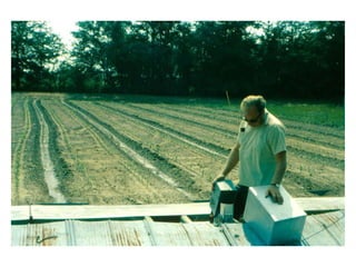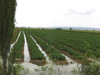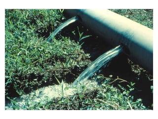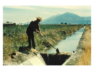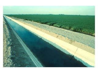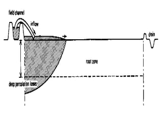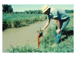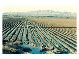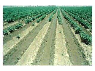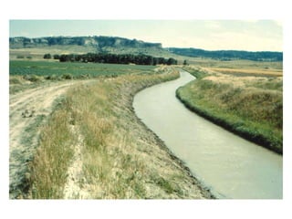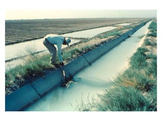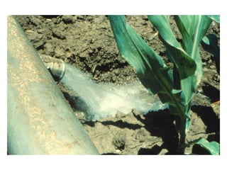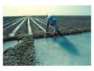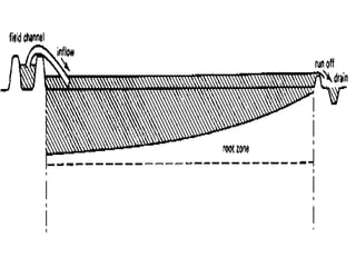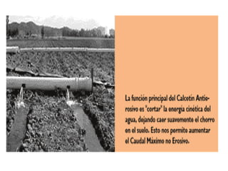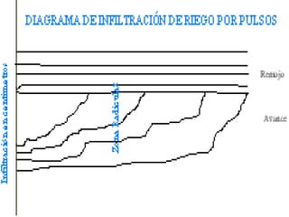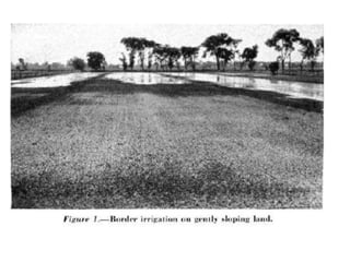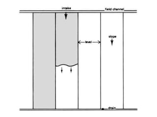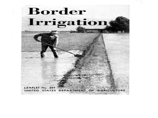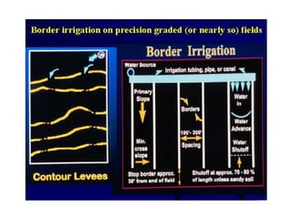 Este documento presenta los métodos de riego superficial, en particular el riego por bordes. Explica que este método divide el terreno en franjas delimitadas por pretiles, donde el agua fluye de forma controlada produciendo una inundación temporal. También describe los criterios de diseño como la pendiente, el caudal y la textura del suelo, y señala que este método puede lograr una eficiencia de hasta 65% aplicando correctamente el diseño, construcción y manejo del agua.