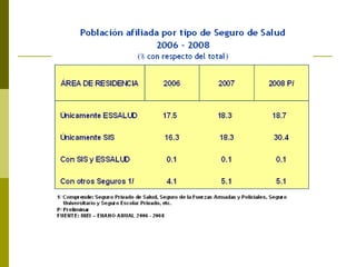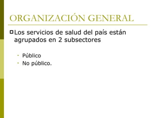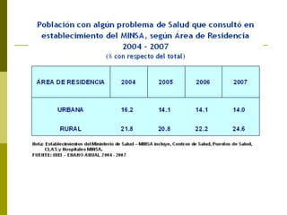 El documento describe el sistema de salud del Perú, incluyendo los sectores público, privado y de seguridad social. El sector público incluye al Ministerio de Salud (Minsa) y EsSalud, mientras que el sector privado incluye clínicas y ONGs. El documento también analiza los problemas del sistema de salud peruano como la falta de cobertura universal, descentralización incompleta, y calidad y financiamiento insuficientes de los servicios.