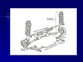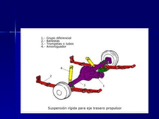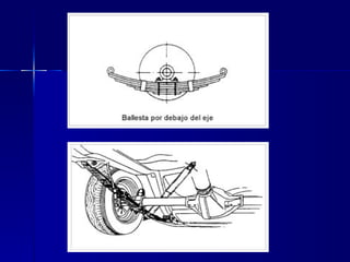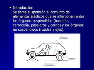 El documento describe el sistema de suspensión de un vehículo. Explica que la suspensión absorbe las irregularidades del terreno para proporcionar comodidad y estabilidad. Se compone de elementos elásticos como muelles y ballestas, así como amortiguadores que absorben las vibraciones. También cubre los diferentes tipos de oscilaciones, componentes de la suspensión e incluye diagramas de sistemas de suspensión rígida e independiente.
