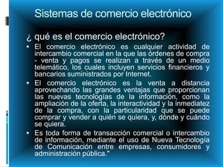 Este documento describe el comercio electrónico, incluyendo su definición, categorías, procesos, tecnologías, tendencias y leyes. El comercio electrónico se refiere a cualquier actividad comercial que involucre órdenes, pagos y transferencias de información a través de medios electrónicos. Se analizan los procesos de compra y venta, así como las categorías B2B, B2C, C2C y C2A. También se discuten temas como seguridad, pagos electrónicos, requisitos para tiendas virtual
