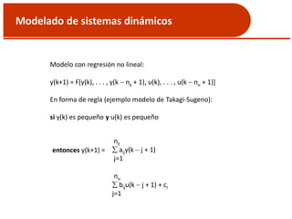 Este documento describe diferentes métodos para el modelado de sistemas dinámicos utilizando modelos difusos. Explica conceptos como modelos de Takagi-Sugeno, estimación de parámetros, agrupamiento difuso, simplificación de reglas y redundancia en modelos difusos. También incluye un ejemplo de aplicación de un modelo difuso de Takagi-Sugeno para la predicción de la concentración de clorofila en lagos.