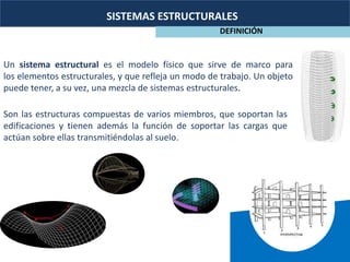 Este documento define y describe varios sistemas estructurales como estructuras de acero, madera, hormigón armado, perfiles metálicos, cerchas metálicas, mallas espaciales, losa de acero, membranas y la madera como elemento estructural. Explica las ventajas y desventajas de cada sistema y cómo funcionan y se usan en la ingeniería y construcción.