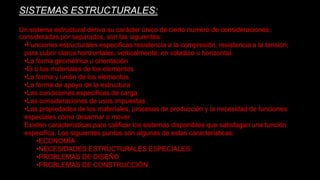 Este documento resume los diferentes tipos de sistemas estructurales, incluyendo estructuras macizas, reticulares, superficiales, auto-soportantes, reticulados o marcos, cajón o muros, y sistemas combinados. También describe elementos estructurales como perfiles metálicos, carpintería metálica, mallas espaciales, cerchas, losas, membranas, concreto armado y muros portantes, así como la madera como elemento estructural.