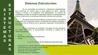 El documento aborda los diferentes sistemas estructurales utilizados en construcción, detallando sus características, ventajas y desventajas. Incluye información sobre sistemas como muros portantes, aporticados, abovedados, tensados, hinchables y mixtos, así como sobre perfiles metálicos y cerchas. Se enfatiza la importancia de elegir el sistema adecuado en función de factores como la seguridad, funcionalidad, estética y costeo en la edificación.