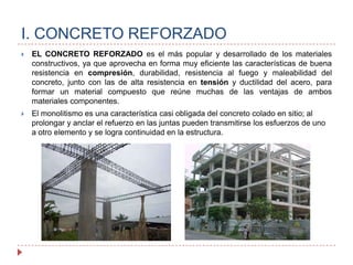 El documento trata sobre los sistemas estructurales de concreto reforzado y acero estructural. Explica que el concreto reforzado es un material compuesto formado por concreto y acero que aprovecha las ventajas de ambos materiales. Describe los componentes principales del concreto reforzado como vigas, columnas y muros estructurales, asi como el refuerzo con armaduras longitudinales y estribos. También cubre los diferentes tipos de perfiles de acero estructural como I, H, U y tubos,
