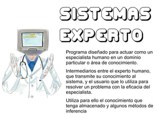 Un sistema experto es un programa diseñado para actuar como un experto humano en un dominio particular, almacenando y utilizando el conocimiento de dicho dominio para resolver problemas de manera similar a como lo haría un experto. Los sistemas expertos razonan sobre la base de conocimientos y reglas para llegar a conclusiones, explicando su proceso de razonamiento. Han sido aplicados con éxito en diversos campos como medicina y minería.