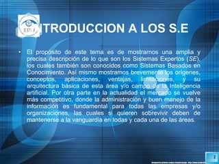 Este documento describe los sistemas expertos, incluyendo su historia, definiciones, características, tipos, arquitectura y componentes. Los sistemas expertos imitan el razonamiento de expertos humanos en dominios específicos mediante el uso de reglas y probabilidades. Su arquitectura típica incluye una base de conocimiento, motor de inferencia, y subsistemas para la adquisición de conocimiento, interfaz de usuario y ejecución de órdenes.