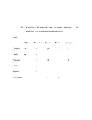 Este documento describe las categorías gramaticales de la lengua wayunaiki. Explica que wayunaiki tiene 6 vocales y 14 consonantes. También describe las oposiciones entre las consonantes y vocales, ilustrando cómo pequeños cambios en sonidos pueden cambiar el significado de las palabras. Además, explica la estructura silábica de wayunaiki, indicando que la sílaba consiste en un núcleo obligatorio que puede estar rodeado opcionalmente por consonantes antes o después del núcleo.