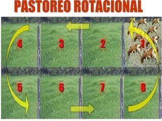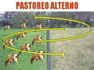 Este documento describe varios sistemas de pastoreo para ganadería ecológica, incluyendo pastoreo continuo, pastoreo alterno, pastoreo rotacional y por franjas, y sistemas silvo-pastoriles. Cada sistema se caracteriza por su número de potreros, periodos de ocupación y descanso, pérdidas de pasto y suelo, y ganancias diarias de peso en el ganado, siendo el sistema rotacional y silvo-pastoril los más eficientes con menores pérdidas y mayores ganancias de peso.