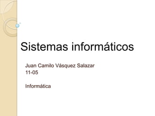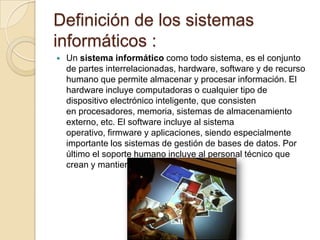 Un sistema informático se compone de hardware, software y recursos humanos. El hardware incluye computadoras y dispositivos electrónicos como procesadores, memoria y almacenamiento. El software incluye sistemas operativos, aplicaciones y sistemas de gestión de bases de datos. Los sistemas informáticos también tienen componentes periféricos como monitores, teclados y otros dispositivos de entrada/salida. El software se refiere a los componentes lógicos como sistemas operativos y aplicaciones, mientras que el hardware son los componentes físicos