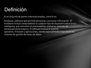 Este documento define los componentes básicos de un sistema informático. Explica que un sistema informático consta de hardware y software. El hardware incluye la unidad central de procesamiento, memoria, unidades de almacenamiento y periféricos. El software incluye sistemas operativos y aplicaciones. Además, describe los tipos de memoria, como la memoria RAM y ROM, y los periféricos de entrada/salida como teclados, pantallas y unidades de almacenamiento.