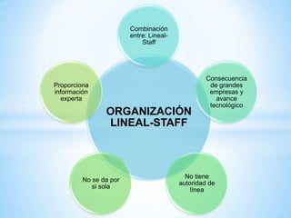 Este documento describe la organización lineal con staff. Este tipo de organización combina los departamentos de línea, que se enfocan en los objetivos externos de la organización, con los departamentos de staff, que asesoran a otros departamentos. Los departamentos de staff proporcionan información experta pero no tienen autoridad directa, mientras que los departamentos de línea tienen autoridad para ejecutar las principales decisiones de la organización. Este modelo se aplica comúnmente en grandes empresas debido al avance tecnológico.