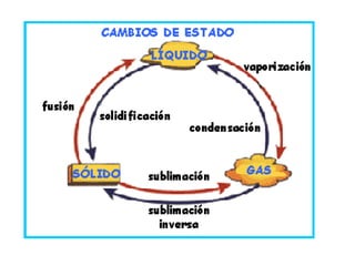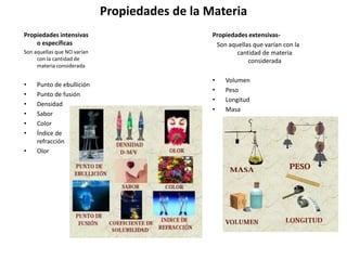 Este documento describe las propiedades y estados de la materia. Explica que las propiedades intensivas no varían con la cantidad de materia, mientras que las extensivas sí. Describe el modelo cinético molecular y cómo las partículas se mueven en los tres estados de la materia: sólido, líquido y gas. También clasifica los sistemas materiales según su composición química y capacidad de intercambio de materia y energía.