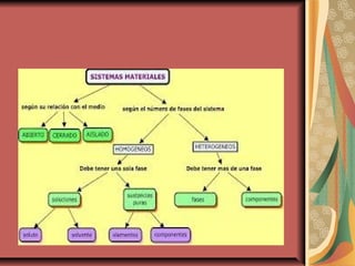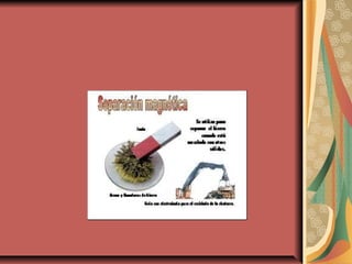 Este documento describe diferentes métodos para separar las fases de un sistema heterogéneo, incluyendo tamización para separar sólidos de diferentes tamaños, filtración para separar sólidos finamente divididos de líquidos, decantación para separar líquidos de densidades diferentes, destilación para separar líquidos que no se mezclan, sublimación para separar sólidos donde uno sublima a gas sin pasar a líquido, y centrifugado para separar líquidos de sólidos.