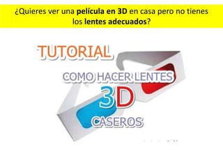 Este documento describe cómo hacer lentes 3D caseros utilizando materiales como papel opalina, celofán o acetato de colores rojo y azul, tijeras y pegamento. Explica los tres pasos: 1) recortar plantillas, 2) pegar las piezas de celofán/acetato en las plantillas, 3) unir las tres partes con pegamento para completar los lentes y poder ver películas y videos en 3D.