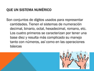 Este documento describe varios sistemas numéricos históricos, incluyendo el sistema decimal, el sistema egipcio basado en jeroglíficos, el sistema griego que usaba letras del alfabeto, el sistema maya basado en 20, y el sistema babilónico que fue el primer sistema de numeración posicional. Explica las características clave de cada sistema y cómo representaban diferentes cantidades.