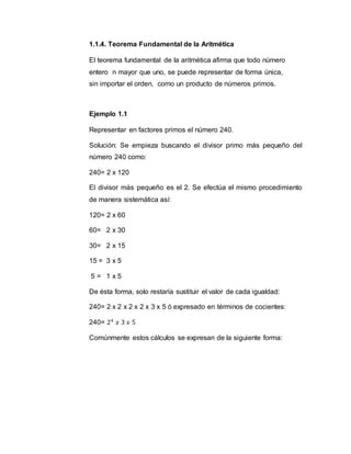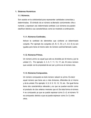 Este documento describe los diferentes tipos de números y sus propiedades. Introduce los números naturales, enteros, racionales e irracionales, y explica cómo estos conjuntos forman los números reales. También cubre temas como sistemas numéricos, números primos y compuestos, expresiones decimales, y propiedades de la suma, multiplicación y orden de los diferentes tipos de números.