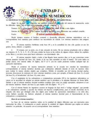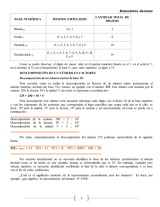 Este documento describe diferentes sistemas numéricos como el binario, octal, decimal y hexadecimal. Explica que los sistemas numéricos más antiguos fueron el babilónico y el romano, mientras que el sistema decimal es el más extendido actualmente. También describe cómo los ingenieros adoptaron el sistema binario para su uso en computadoras debido a que sólo requiere dos dígitos. Finalmente, explica cómo convertir números entre diferentes sistemas numéricos usando descomposición en factores y divisiones sucesivas.