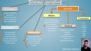 El documento detalla el sistema operativo MS-DOS, su historia, funciones y componentes esenciales. Se discuten los comandos internos y externos, así como la evolución de MS-DOS desde su creación en 1981 hasta su integración con Windows. Además, se menciona la utilidad de MS-DOS en equipos antiguos y su impacto en otros sistemas operativos.