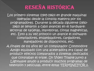 Los primeros sistemas operativos funcionaban en grandes máquinas operadas por programadores desde una consola central. En las décadas de 1950 y 1960 hubo avances en hardware como lectoras de tarjetas e impresoras que impulsaron el desarrollo de software como compiladores y manejadores de dispositivos. Los sistemas operativos gestionan los recursos del ordenador en sus niveles más bajos y proveen interfaces para facilitar la comunicación entre usuario y máquina.