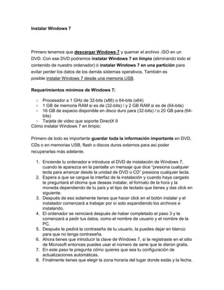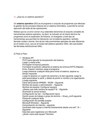 El documento proporciona información sobre sistemas operativos y cómo instalar Windows 7 y Linux. Explica que un sistema operativo gestiona los procesos básicos de una computadora y permite ejecutar otras operaciones. Luego detalla los pasos para instalar Windows 7 en una partición o en limpio, incluyendo particionar el disco duro, y los requisitos mínimos. Finalmente, resume los pasos para instalar una distribución de Linux como Red Hat, incluyendo seleccionar idioma, teclado, particionar el disco y montar particiones