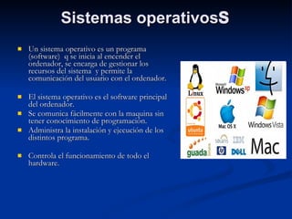 Un sistema operativo es un programa que se inicia al encender el ordenador y se encarga de gestionar los recursos del sistema y permitir la comunicación entre el usuario y la máquina. Los sistemas operativos más utilizados son Windows, MacOS y Linux en ordenadores personales, y versiones de Linux como UNIX en servidores. Los sistemas operativos se dividen en de procesamiento por lotes, multiprogramación y multiusuario. Los controladores gestionan la comunicación entre dispositivos y el sistema operativo.