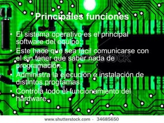 Este documento describe las principales funciones de los sistemas operativos, incluyendo administrar la ejecución de programas, controlar el hardware y hacer que sea fácil comunicarse con la computadora. Explica que los sistemas operativos se clasifican según la cantidad de tareas, usuarios o equipos que pueden controlar. También menciona algunos sistemas operativos comunes como Windows, Macintosh y Linux y cómo se pueden eliminar programas no deseados en Windows XP.