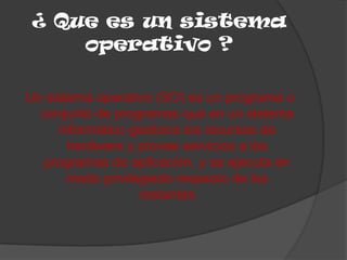Un sistema operativo es un programa que gestiona los recursos del hardware y provee servicios a los programas de aplicación. Existen varios tipos de sistemas operativos como DOS, UNIX, OS/2 y Windows. DOS era monousuario y ejecutaba un solo programa a la vez, mientras que Windows es popular hoy en día. Linux es multiusuario y multitarea, y se ha vuelto muy utilizado debido a su estabilidad y fiabilidad.