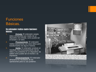 El documento describe las cuatro funciones básicas de un ordenador: entrada, procesamiento, salida y almacenamiento. Explica que el hardware es la parte física del ordenador mientras que el software incluye los sistemas operativos, lenguajes de programación y programas de aplicación. Define un sistema operativo como un programa que gestiona los recursos del sistema y actúa de intermediario entre el usuario, el software y el hardware.
