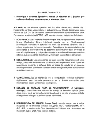 Este documento presenta información sobre varios sistemas operativos incluyendo Solaris, Windows 7, Windows XP y Windows Vista. Describe brevemente las características y desarrollo de cada sistema operativo. El documento fue escrito por Andrés Quintana Martínez y Orlando Jaraba Pacheco para un curso de Ingeniería de Sistemas en la Corporación Universitaria Minuto de Dios.
